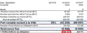 Le nouveau contrat avec Indigo prévoit un abaissement du seuil de partage* des recettes. Il passerait de 222 000€ TTC à 175 740€ TTC. Il y a donc une révision à la baisse du "business plan" de Indigo. Le chiffre d'affaires du délégataire avait été estimé à 208 797€ en 2016 et à 222 771 € en 2017 avec un seuil de partage entre la ville et Indigo à 222 000€ comme le montre le tableau ci-après :
